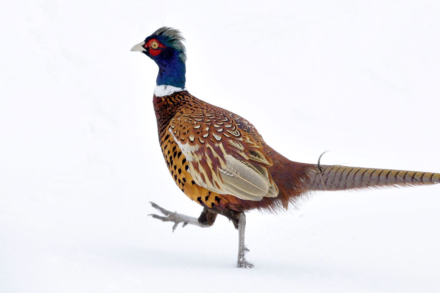 O ile nawet po obfitych opadach śniegu ptactwo potrafi dogrzebać się jakoś do ziemi i znaleźć nasiona traw, drzew, to już po przymrozkach ten śnieg zamienia się w twardą skorupę, a przy odwilży – w lód. Co gorsza, najbardziej wygłodniałe osobniki, które podejmują karkołomną próbę znalezienia pożywienia na otwartej przestrzeni, stają się łatwym celem dla drapoli – lisów, myszołowów. Na zdjęciu samiec bażanta. Piotrek