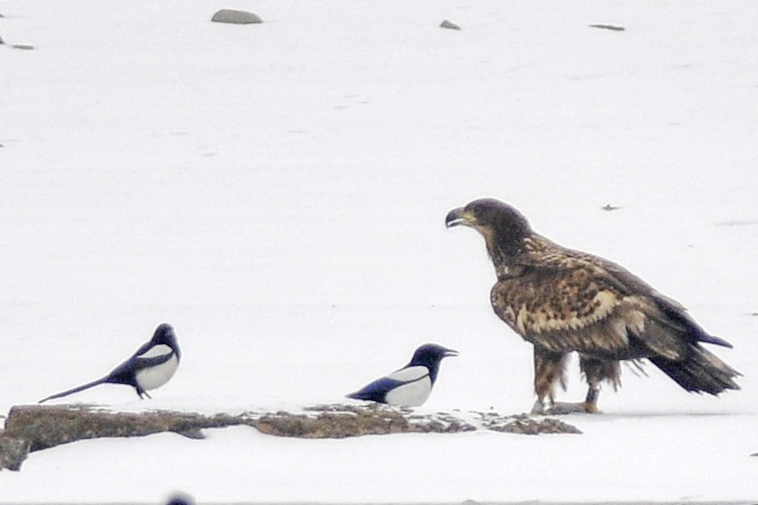 Sroki to takie ptasie wersje hien. To małe wredoty, które wszędzie zajrzą i wszystko zwęszą. A jak zwęszą jakąś padlinę, to nie odpuszczą i wyciągną ją z pyska choćby lwu. W tym przypadku – jak na zdjęciu – sroki zaczęły krakać na samego miłościwie panującego na Jeziorsku bielika. Swoją drogą, to drapieżnik dużo większy od orła. Sroki chciały mu odebrać rybę. I odebrały. Bielik nie wytrzymał i w końcu podwinął ogon. Piotrek