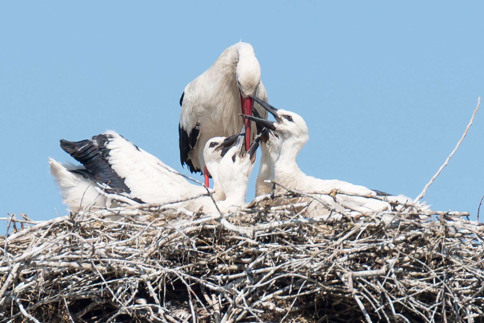 Młode boćki rosną błyskawicznie. W gniazdach zaczyna robić się coraz ciaśniej, a rodzice nie poświęcają pociechom już tyle uwagi co np. kilka tygodni temu. Nie przesiadują z nimi bez przerwy i nie osłaniają ich skrzydłami przed słońcem. Może celowo? Niedługo boćki będą chciały uczyć się latać. Co godzinę – dwie któreś z rodziców zlatuje, żeby nakarmić i napoić przychówek. Piotrek