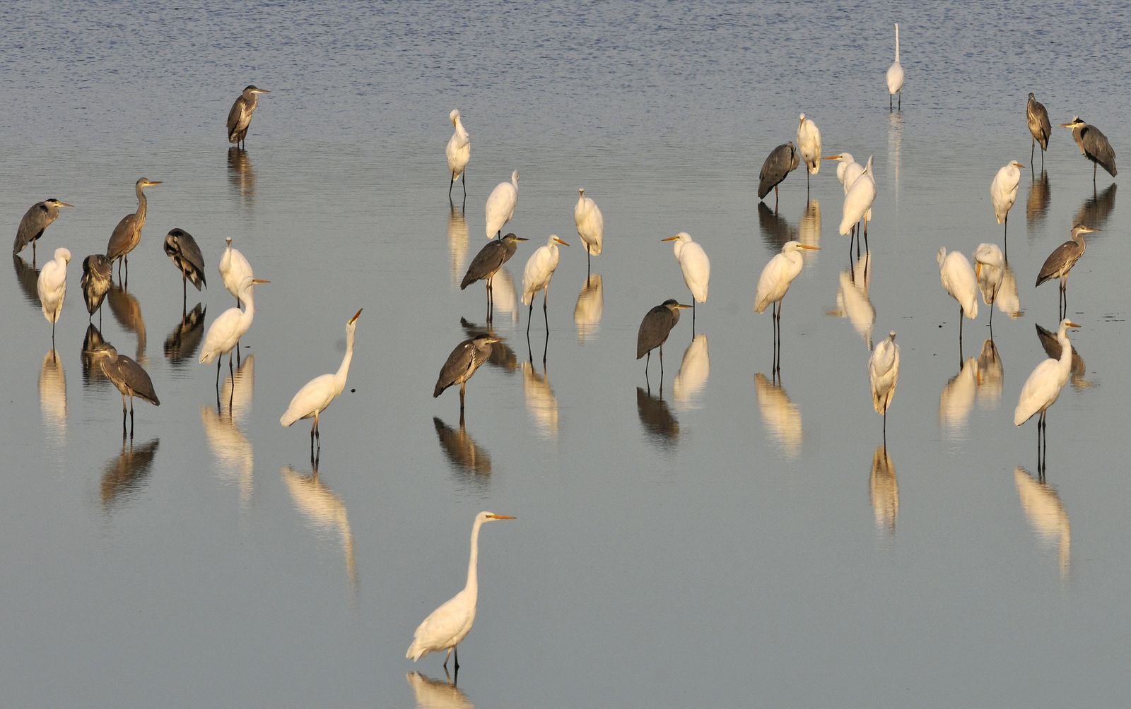 Stoją po pióra w wodzie na tych swoich długich, cienkich nóżętach. Stoją jak na szczudłach. Jak ryba trąci ogonem którąś z tyczek, to ich właścicielka od razu wkłada łeb pod wodę. Ryba może i wywinie się spod dzioba, ale spłoszona ani chybi trąci znów inną tyczkę… Im więcej czapli na jeziorze, stawie, tym lepiej (dla ptaszydeł). Na zdjęciu białe połączyły siły z siwymi. Piotrek