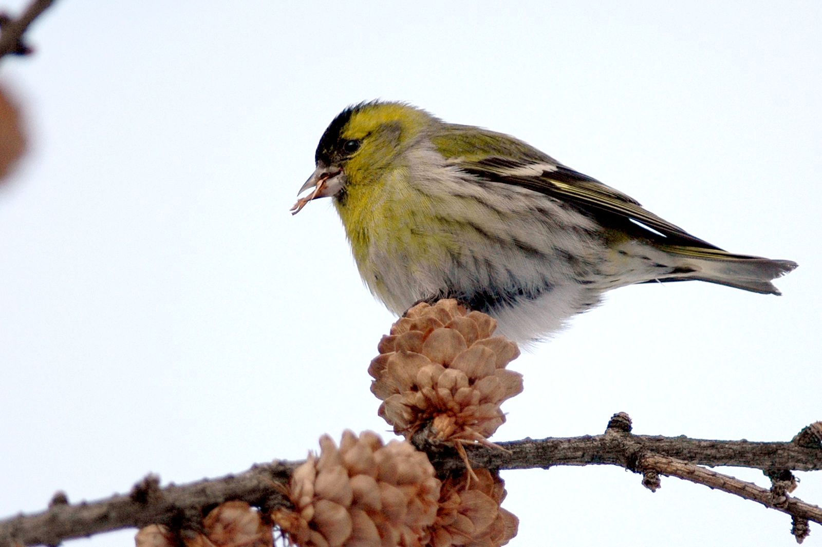 Dla ptaszków z mocniejszymi dzióbkami nasiona modrzewiowych szyszek są jedną z głównych pozycji ich zimowego menu. Stąd modrzewiowe zagajniki to świetne miejsce do obserwacji ptactwa. Tyle że ptaki obrabiają zwykle drzewa od góry, więc mało je widać. Trzeba mieć trochę szczęścia i stanąć akurat pod drzewem, którego szyszki są już z grubsza ogołocone. Ptaki schodzą wtedy niżej. Są łaskawsze dla obserwatora, bo… nie mają wyjścia. Na zdjęciu czyżyk. Piotrek