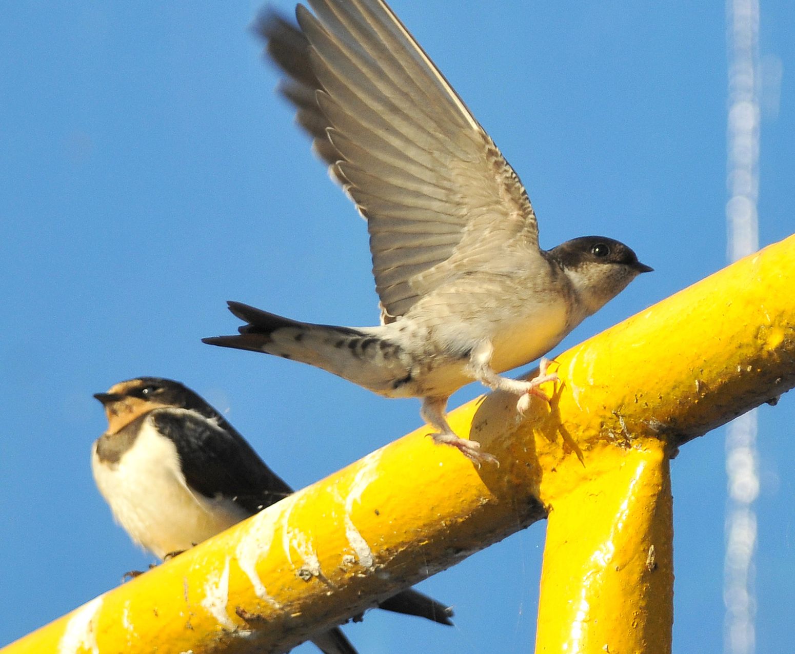 Dwie jaskółeczki kuzyneczki usiadły na rurze. Ta z czerwonym szalem, to dymówka. Tę drugą, co wygląda jakby ją ktoś od dołu, od ogona aż po dziób pociągnął białą farbą, to oknówka. Dymówka lubi uganiać za muchami i komarami nisko, niziutko nad ziemią, z kolei szybsza i zwinniejsza od niej w locie oknówka połyka owady, które potrafią wzbić się w powietrze wyżej. Jednakże bez względu na upodobania kulinarne czy szkołę latania, wszystkie one: dymówki, oknówki i brzegówki – tej akurat nie widać na zdjęciu (jest bardzo, bardzo podobna do oknówki) zbierają się jesienią w wielkie formacje. Razem odlatują na zachód, południowy wschód i południe. Razem posypiają w trzcinowiskach. Najdłużej zwlekające z migracją osobniki można jeszcze czasami spotkać w listopadzie. Piotrek