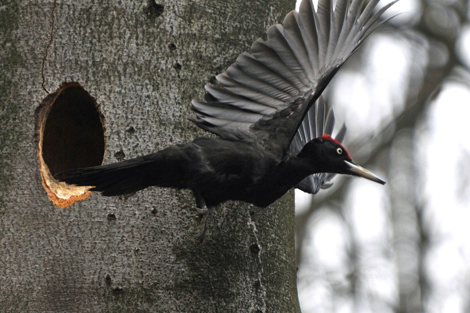 – licząc w centymetrach. To proporcje, które zachowuje każdy dzięcioł czarny przy budowie dziupli. Wlot do niej jest owalny i bardzo głęboki. Co roku czarny zmienia swoje lokum. Każdej wiosny, zaczyna wykuwać takie swoje rzemieślnicze arcydzieło od nowa. Z tym, że z początku prace prowadzi nad kilkoma naraz. Aż w końcu… skupia się nad dłubaniem jedynie w tym, w którym najbardziej mu się podoba. W takim miejscu samica składa jaja. Poza okresem lęgowym dzięcioły pomieszkują w swoich dziuplach. Jak miłośnikowi ptaków udaje się natrafić na terytorium któregoś, to zagadką zawsze jest: w której dziurze jegomość siedzi… Piotrek