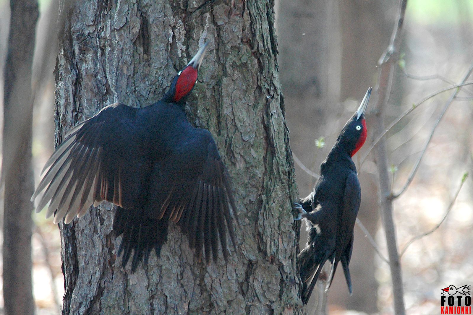 Dzięcioł od rana do wieczora ciężko pracuje – przecież trudno nie nazwać pracą ciągłego walenia dziobem w drzewa. Wydłubuje z pni robale i je zjada. Nie lubi mieć przy tym konkurencji. Dlatego zawsze pod koniec dnia, zanim poleci spać do dziupli, siada jeszcze na wierzchołku wysokiego drzewa i wydaje dziwaczne (terytorialne) głosy. W zależności od gatunku: poskrzekuje, pogwizduje, a dzięcioł czarny (na zdjęciu) to akurat śmiesznie piszczy, dosłownie jak taka gumowa zabawka dla psa. Daje tym samym do zrozumienia, że wszystkie drzewa w promieniu kilkuset metrów należą tylko do niego. I na ogół inne ptaki przestrzegają wytyczonych w ten sposób granic. Zdarzają się też niespodzianki: wypoczęty, gotowy do pracy dzięcioł tuż nad ranem wyszedł ze swojej dziupli, a tu – kolega. Spalskie lasy. Piotrek