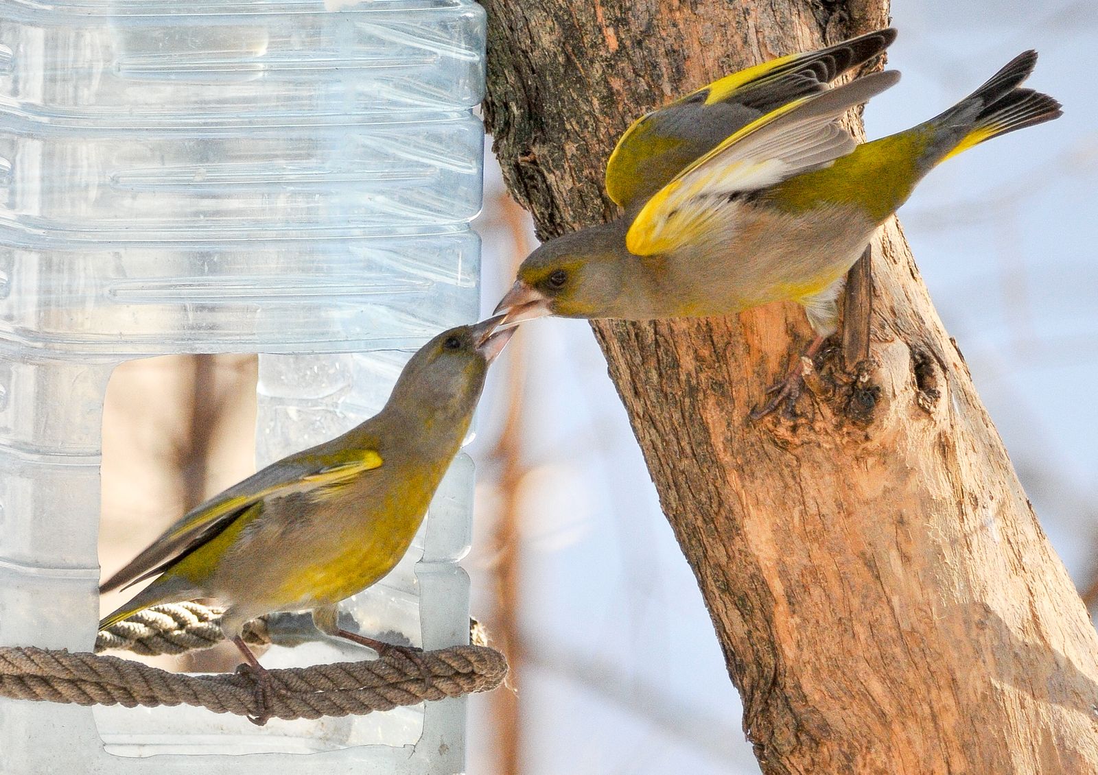 Dzwońce to ptaszki, które rzeczywiście mają coś wspólnego z dzwonkami. Jak jest ich sporo, to dźwięki, jakie z siebie wydają, nakładając się na siebie, przypominają dzwonienie malusieńkich, takich tycich, tyciuteńkich dzwoneczków. Przyjemnie jest ich posłuchać. Przyjemnie się na nie patrzy. Są takie oliwkowe, zieloniutkie z żółtymi „lusterkami” na skrzydłach. Ale mają, niestety, brzydką cechę charakteru – jak zalatują do karmnika, to nie tolerują towarzystwa innych ptaków i od razu je przepędzają. Bo dzwońce widzą tylko czubek własnego dzioba. Piotrek