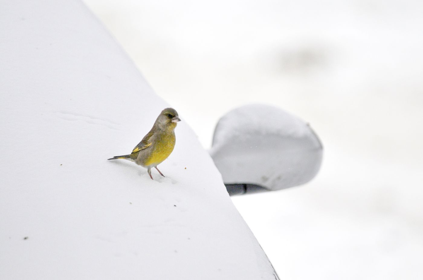 Kombinacja opadów śniegu, lekkiej odwilży, a potem mrozu zawsze odbiera drobnym sikorkom, strzyżykom, czyżykom możliwość znajdowania nasion traw i drzew na ziemi. Ptaszki nie mogą przebić się przez sztywną kołdrę białego puchu i cierpią głód. Wtedy tylko te co cwańsze, przyzwyczajone do życia w mieście osobniki, patrolują samochodowe parkingi. W obleczone skorupą śniegu pojazdy łatwo wczepiają się niesione przez wiatr nasiona, czasami jakieś robaki. A na białym widać jak na dłoni. To znaczy jak na skrzydle. Na zdjęciu: dzwoniec. Piotrek