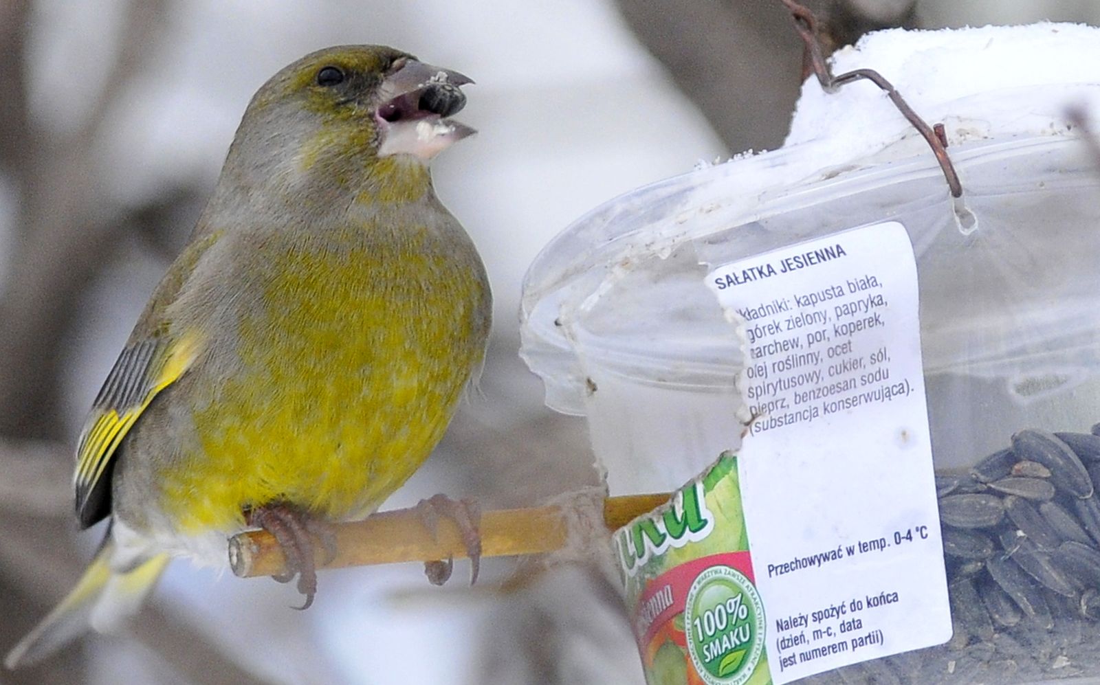 Dziób dzwońca działa jak otwieracz do konserw. Połówki dzióbka delikatnie na siebie zachodzą, stąd dzwoniec potrafi precyzyjnie nacinać i łuskać nasiona. Inne gatunki ptaszków, chcąc dobrać się np. do takich ziarenek słonecznika, muszą się nieźle namęczyć z łupinkami, a dzwoniec?! Ten obkrawa je dookoła, kłapie dziobem, ziarenko wpada mu do gardła, a łupiny spadają na ziemię. Piotrek