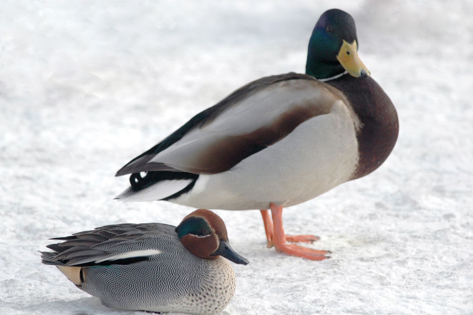 Na oblodzonym stawie wylądowała kaczka cyraneczka. A właściwie dorodny kaczor. Zaraz za nim zaczął lądować kaczor krzyżówki. Z impetem trzepał skrzydłami, chcąc koniecznie, nie wiedzieć czemu, usadzić swój wielki kuper tuż obok cyraneczki. O mały włos, o małe piórko, a doszłoby między kaczorami do kolizji. Samiec cyraneczki aż przysiadł. Pewnie się wystraszył. Ale co się dziwić. Piotrek