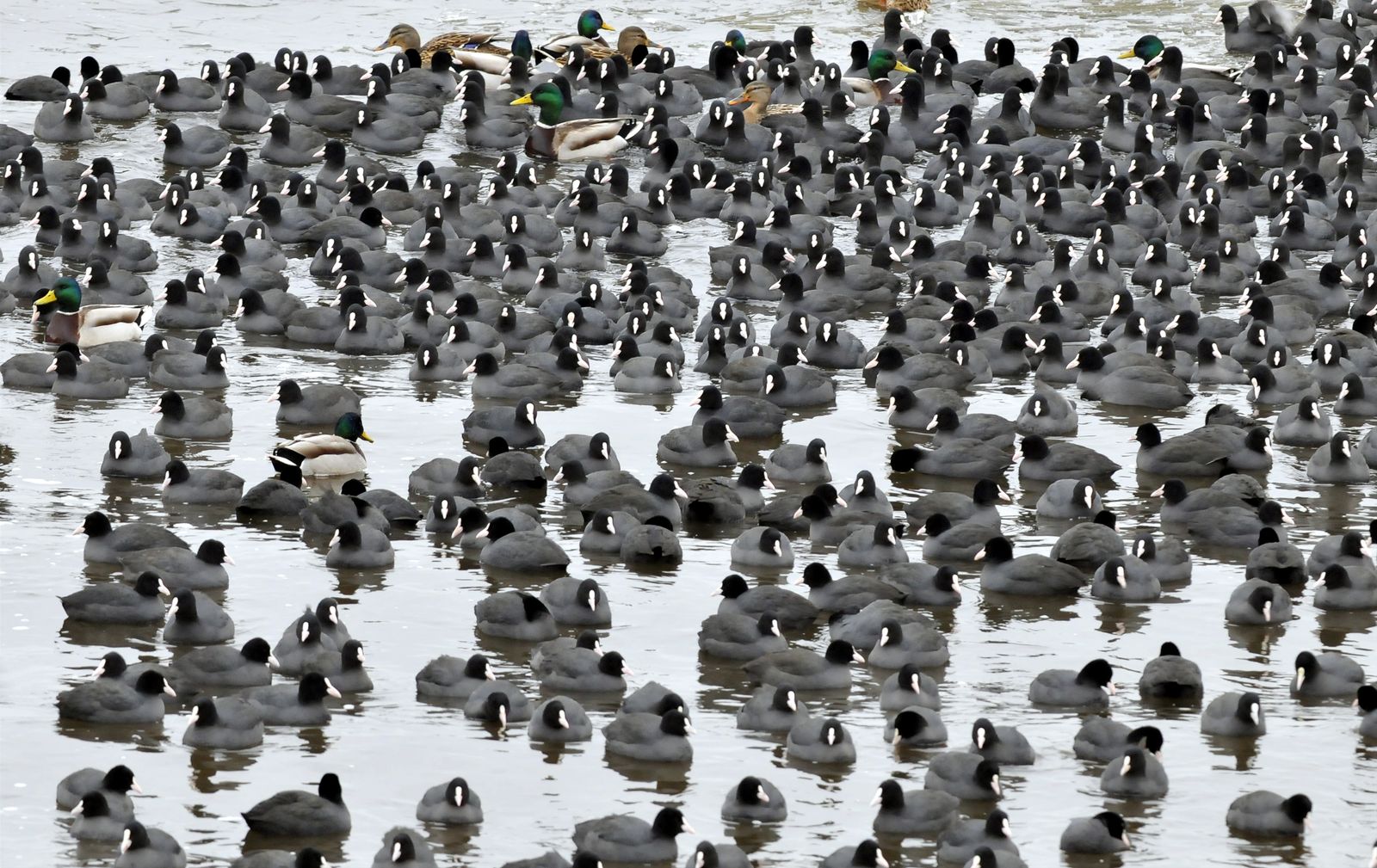 Łyski są często mylone z kaczkami. Fakt, są podobnej wielkości, a jak pływają i nie widać tych ich dużych, o, przepraszam… ogromniastych stóp, to rzeczywiście sylwetką przypominają kaczki. I chyba dlatego nikomu, kto nie przeczytał o łyskach jakiejś mądrej książki, nie przyszłoby do głowy, że ten ptak jest bliskim kuzynem żurawia! (na podstawie podobieństwa cech anatomicznych). Ba, według książkowych systematyk, łyska przynależy do rzędu żurawiowych! I stąd pewnie ta jej odwaga. Bo jak trzeba, to przegoni nawet łabędzia. Zimą w stadach liczących po kilka tysięcy osobników łyski zaczynają dobierać się w pary. Piotrek