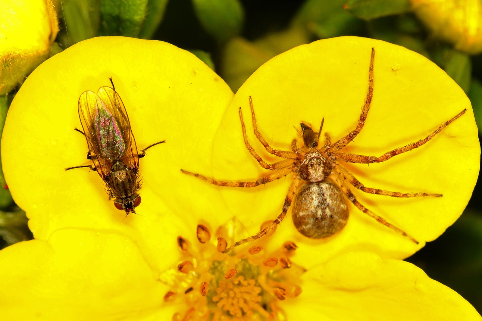 Dwa światy. Ona fruwa, on chodzi, a w zasadzie, to głównie siedzi. Siedzi w jakiejś dziurze i czyha. Czyha na nią. Bo ona stoi na pierwszym miejscu w jego menu obiadowym. Ale akurat dwudziestego szóstego kwietnia coś się zmieniło – ona jakoś przed nim nie uciekała, a on jej wcale nie chciał chwytać. Przycupnęli na żółtym płatku jedno obok drugiego jak dobrzy kumple. Jednak gdy przyjrzeć się zdjęciu, to widać, że on tym razem wybrał sobie komara. I najzwyczajniej w świecie był już zajęty. Piotrek