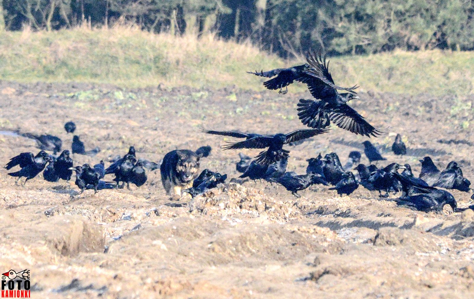 Na skraju lasu padła dzika zwierzyna. Zleciały się kruki. Ale nie kilka – jak to zwykle się widuje – tylko z dwieście! Padlinożercy! Kruki to nie jakieś tam ptasie móżdżki, ponoć są tak inteligentne jak psy. Nie spodobała im się moja obecność, coraz więcej zaczęło krążyć mi nad głową. Zrobiło się nieprzyjemnie. Mnie obkrakały, a psa, który pojawił się na polu, w ogóle się nie bały. Pies uciekł. Ja też. Piotrek
