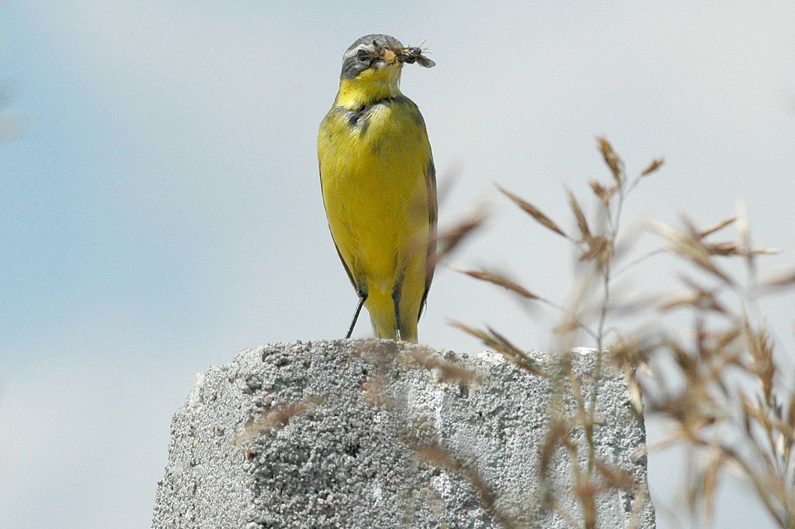 Jak idzie burza, to owadom trudno się fruwa. Przy spadku ciśnienia większość robactwa obniża lot albo wręcz od razu przysiada. Na łące, na źdźbłach trawy, ptakom trudno wypatrzyć cel, stąd taki jak na zdjęciu betonowy granicznik jest prawdziwym eldorado dla połykaczy much. Dla ptaka bycie wolnym jak ptak wcale nie oznacza życia usłanego różami. To ciągłe uganianie się i cwaniakowanie. Bo jeść coś trzeba. Na zdjęciu: pliszka żółta ze zdobyczą. Piotrek