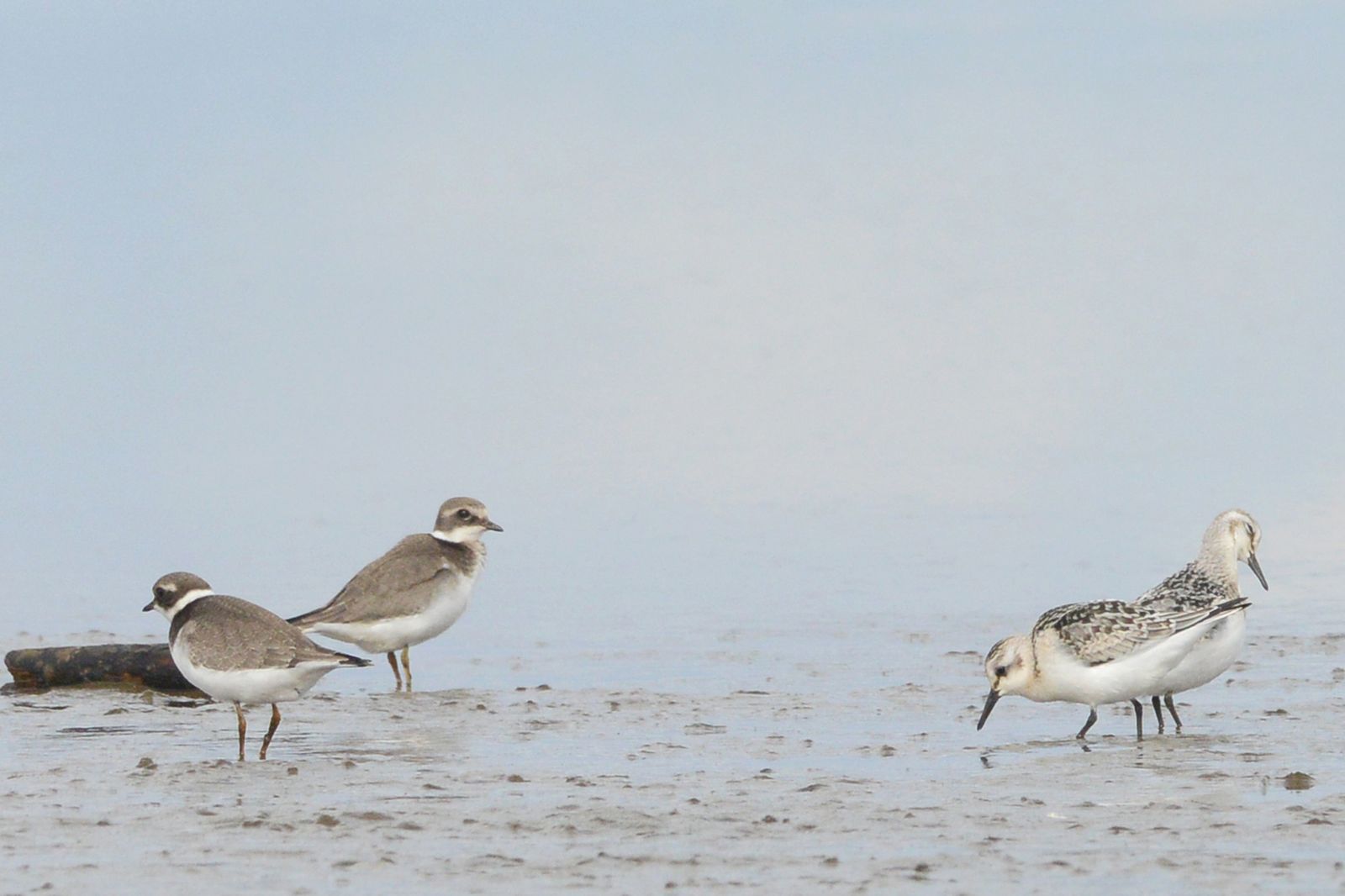 Zalew Jeziorsko. Niestety, te najciekawsze gatunki ptactwa wodnego – jak na złość – zawsze brodzą hen, hen daleko od brzegu. I żeby je podpatrywać, trzeba się zamaskować, wtopić w nadbrzeżną roślinność (a najlepiej wyglądać jak roślina) i czekać, aż jakiś ptaszek łaskawie podleci bliżej. Można też brodzić po kolana w mule, ja jednak wolę metodę właśnie „na roślinę”. Ostatnio, po kilku godzinach takiego wyczekiwania, stali się dla mnie łaskawi goście z Dalekiej Północy – Grenlandii i Skandynawii – (na zdjęciu od lewej) sieweczki obrożne i piaskowce (w Polsce przelotem). Piotrek
