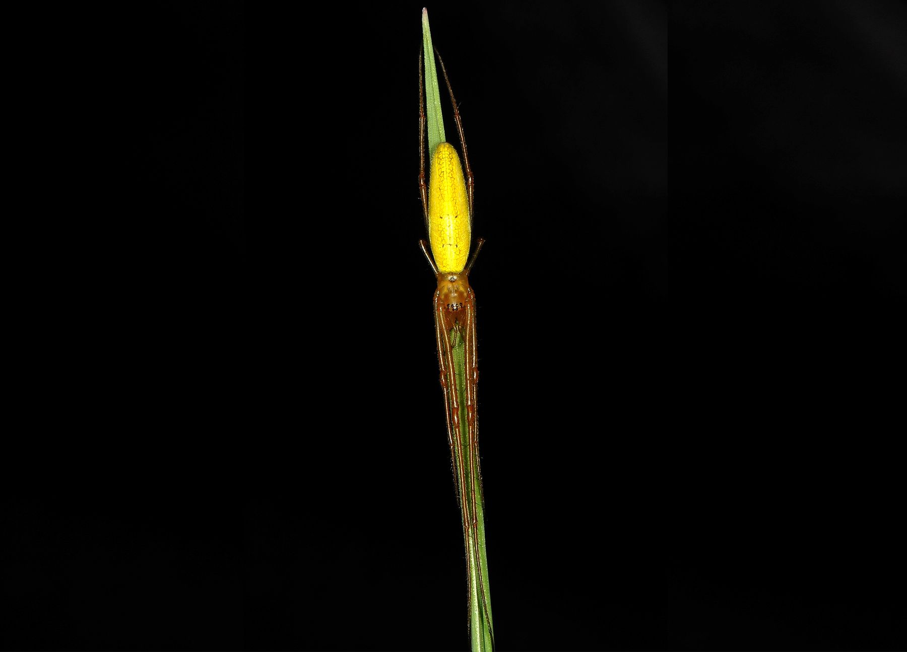 Wiele gatunków pająków nie rozwiesza sieci łownych, tylko stosuje zasadzki albo najzwyczajniej goni za ofiarami. Do takich aktywnie polujących pająków zaliczają się te z tak zwanej rodziny ślizgunowatych. Ich charakterystyczną cechą są bardzo długie i silne odnóża, które umożliwiają błyskawiczny zryw, skok i bardzo, ale to bardzo szybki bieg – prawie niemożliwy do uchwycenia ludzkim okiem. Dodatkowo ślizguny poruszają się nie tylko do przodu, na wprost. Lubią też w bok – jak kraby. Na zdjęciu: podłużnik. Wkomponował się w źdźbło trawy. Czyha. Niestety, fotografowałem go tylko ten jeden, jedyny raz w życiu. Konia z rzędem temu, komu udałoby się wypatrzyć tę bestyję na spacerze. Piotrek