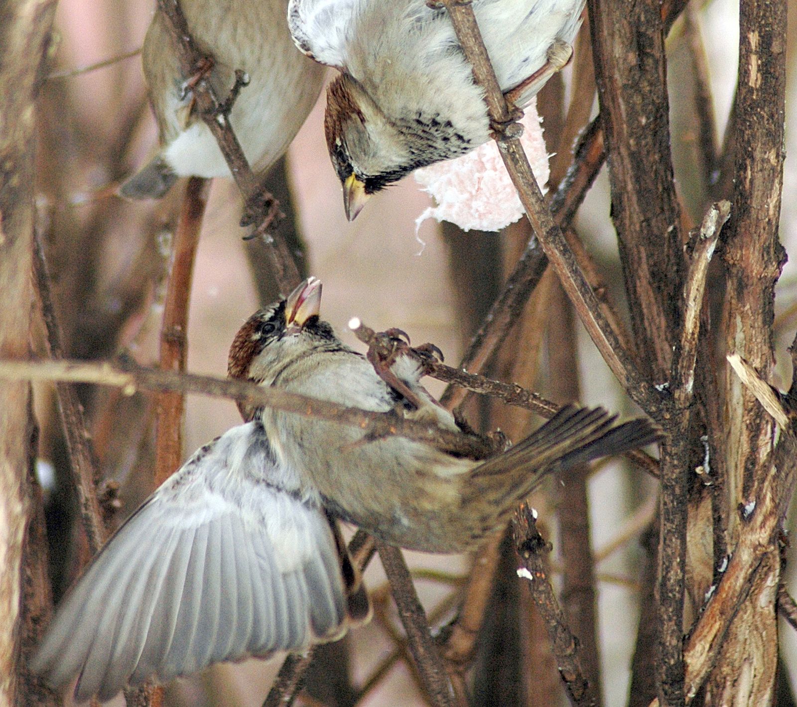 Zimą zazwyczaj robi się nam żal ptaków, w związku z czym wybieramy się do sklepu, żeby kupić słoninę. I kupujemy. Taki najładniejszy kawałek, rzecz jasna. Wywieszamy ją czy to na balkonie, czy to na jakimś drzewie, nieważne. Zapracowani, zabiegani, zazwyczaj po upływie miesiąca, dwóch miesiącach dostrzegamy w końcu, że nasza słonina dynda na drucie w stanie prawie nienaruszonym. Ptaka ani widu, ani słychu. Dlaczego?! Głupie ptice nie mają zaufania?! Boją się? – Otóż ptaki chyba jednak nie są aż tak głupie. Po prostu nie lubią nieświeżej słoniny. I żeby zaskarbić sobie to ich zaufanie, to do mięsnego po słoninę powinniśmy biegać przynajmniej dwa razy w miesiącu. Możemy też oczywiście zrobić sobie zapasy w zamrażalniku. Koniecznie jednak trzeba pamiętać, żeby zdejmować im tę starą i wywieszać świeżuteńką. Nieświeża staje się dla ptaków zwykłą trucizną. I tyle. Ptaki przekazują jakoś między sobą informację o ludziach, którzy mają dobre chęci. Jak? Nie wiem. Ale przekazują. I w końcu przylatują. I potrafią się odwdzięczyć. Na zdjęciu wróbelki. Piotrek